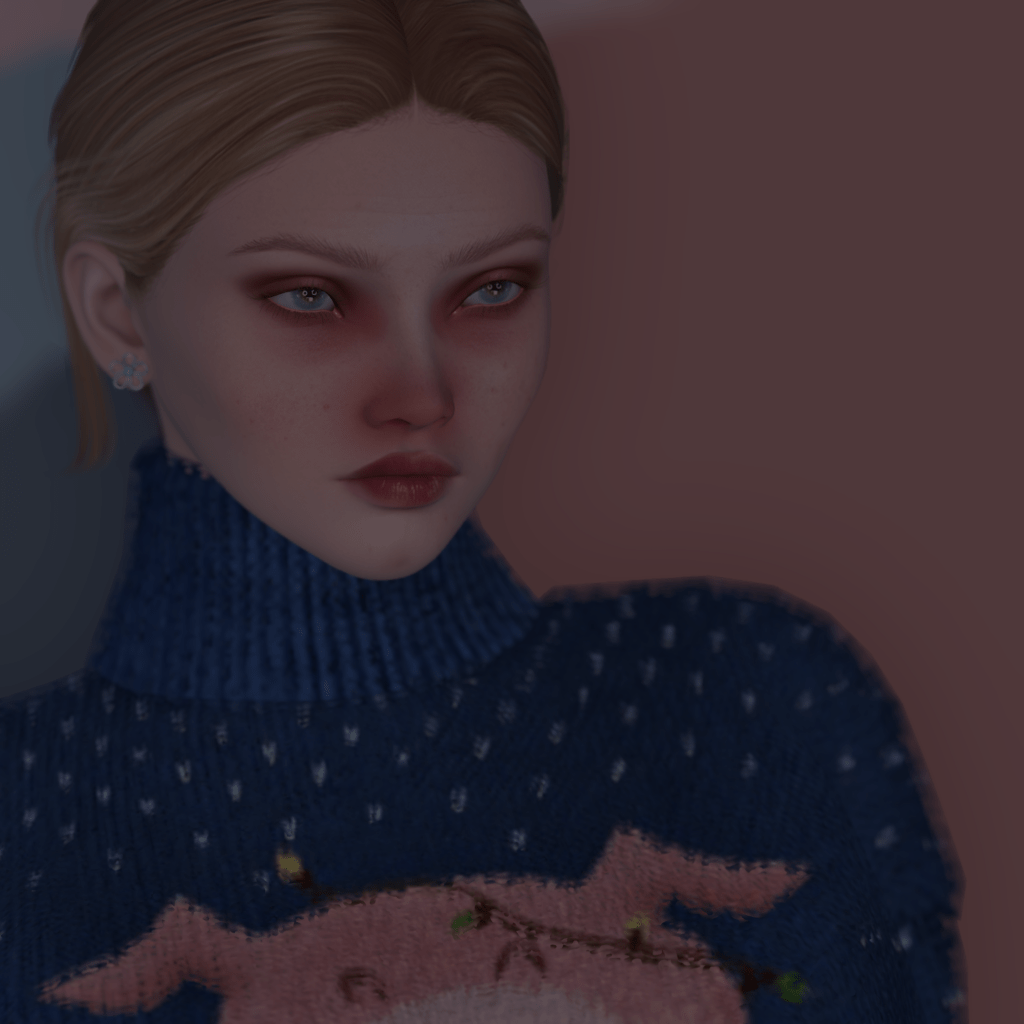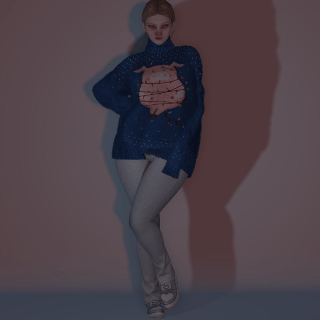 For clothing, I opted for this totally warm and very funny Long & Home sweater by Sorumin, I love Yule pigs! Yule is a mid-winter tradition older than Christmas. A feast dedicated to Freyr, God of Yule and Fertility. Many traditions stemming from Yule have been incorporated into Christmas, to make the Christian feast more palatable to pagans. How’s that for appropriation? Anyway, I am rambling. Under the sweater, I even added Erratic‘s racerback (BOM) tank because you know how those Xmas sweaters are always itchy? Even though you don’t see it, it’s there. I know it’s there. I feel it’s there! My pants are from the Luna Lounge set by Osmia and you can almost feel the softness of the stretchy fabric. Elastic waistband of course. I mean, I really wouldn’t know, right, but My SL, My Imagination! My sneakers are from Friday, and they are pretty much my all-time favorites. The cute heart shape on the nose always makes me smile! Finally, I added the Daisy gem studs from Yummy‘s mega Dreamy earring pack