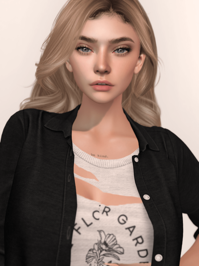 Here you have her again, unedited this time, and instead of the addon, I am wearing the tooth layer from the same pack from Avarosa, which I normally don’t really like, but this one is perfect, especially for pictures. My hair is from Doux, Tzuyu, and the blouse and shirt I am wearing here is from the Baggy Overshirt set from Fashionably Dead. My eyes today are Tville‘s, from the Glorious eyes collection, and the Be Kind tattoo on my chest is from Alba.