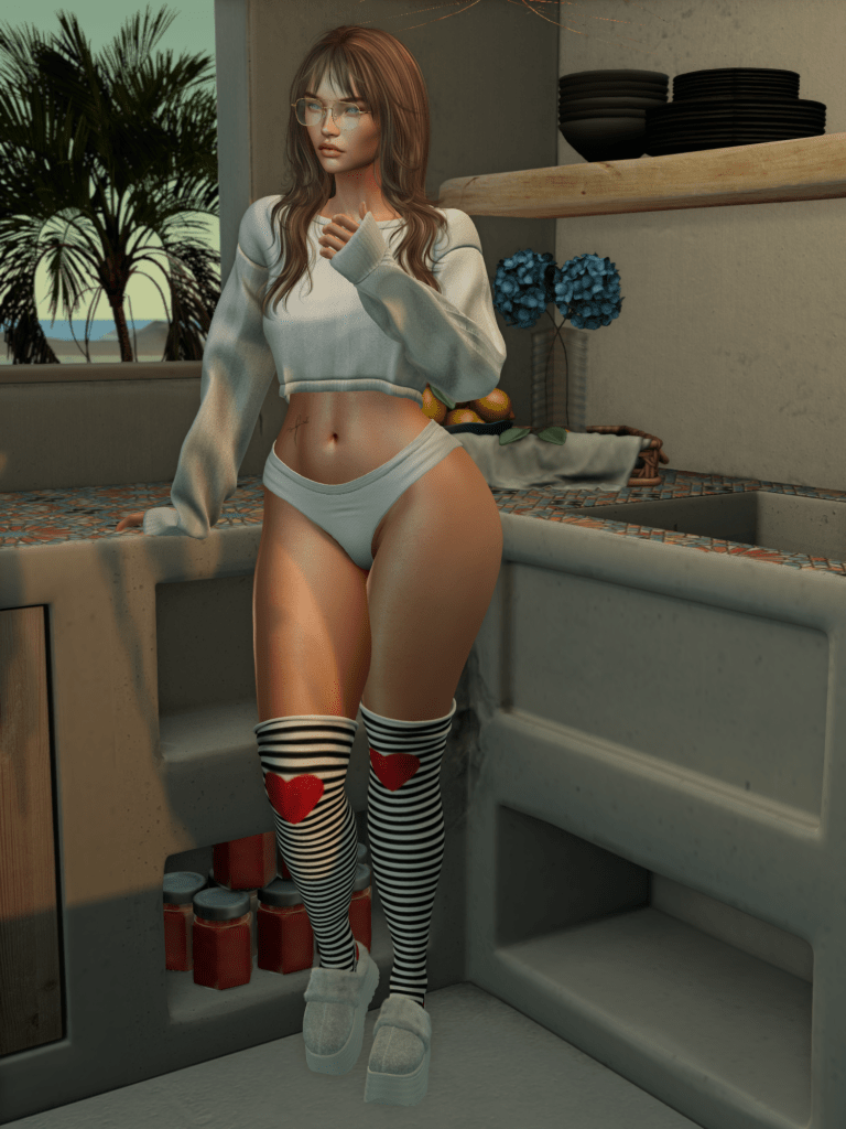 Cutting the meat like a pro! Yet totally unprofessional in my jammies. At least they are white! And from Aurun. I’m actually pretty unfashionable today but hey, nobody but the cat is watching me in the kitchen! Oh well, and you of course. But aren’t these Brae socks form Elikatira adorable? And with Reign‘s Funkette platforms from last Friday’s FLF it is almost a kind of stylish? Oh and I am wearing also the double rimmed glasses fro Cheezu, because I needed them!