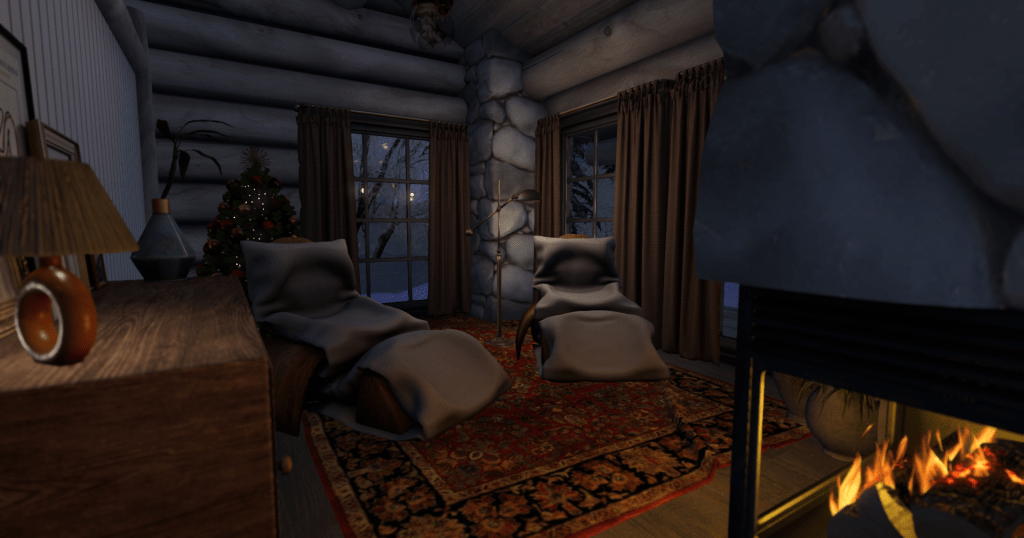 Every winter I put up a little cabin in a winter scene to pass the SL holidays in, no matter what my regular living situation it. And it was time, very much so, to put on this year’s! I rezzed a dome high above my land, and it’s an OLD one. Residents of a certain age will remember the long gone shop Turnip Homes, and the amazing stuff they made, among which a series of skydomes with changeable atmospheres. I just inspected mine, an the newest element on the one I have rezzed is from 2011! It still looks good though. I love it and I pretty much dig it up every year!