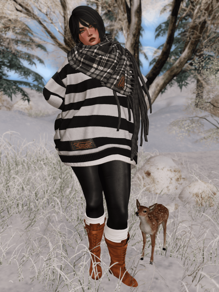 I have been outside in the snow all day, and I am cold! However, I also think today’s outfit is pretty amazing, with the super comfy sweater and scarf from Chronokit at TMD over Alaskametro<3‘s pleather leggings (BOM) and Friday‘s Arizona boots.