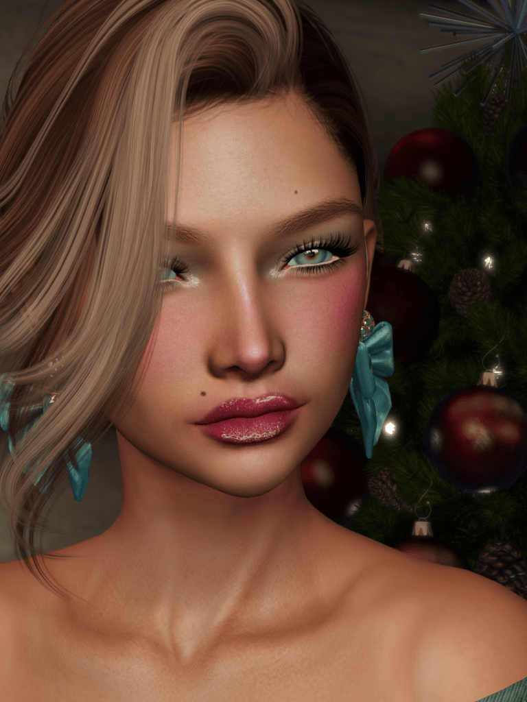 For my makeup, I actually went with tome of the Santa Inc bonus items. If you spend 800 L$ at the event, you’re eligible for one of 2 collections of awesome gifts, and if you spend 1500 L$, you automatically get both! I am wearing Avi-Glam‘s glitter eyeshadow, for some extra cheer, and Jack Spoon‘s Harmony blush, because that mulled wine sure hit! My lipstick is an older item from Goreglam, Billions, but it’s one that I break out often because I love it!