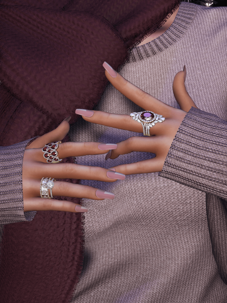 I felt like burgundy today. And this is why I am wearing Fashionably Dead‘s Holiday pants in a lovely corduroy, paired with Ricielli‘s Manon sweater in the palest of pinks. My scarf you may recognize from yesterday’s entry, is Osmia‘s Sofi scarf ( I keep reading soft scarf… because it looks so soft I think!) and my shoes and purse are in a pink nude by Salvadori, the Romy pumps and the Cida baguette. The relative simplicity and casual character of this outfit, allowed me to go wild on my rings, and they are from Piece of Me, the Amias ring set and since I took a close-up, my nails are from Belle Epoque, from the Angie set.