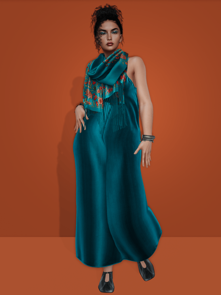 The Kashmiri scarves are actually a pretty old item from Zaara‘s store. My inventory folder system tells me they have been in there since 2019, but today, they’re as beautiful as then, and they come unrigged, so you can fit them to your body! For my jewelry I stuck to only the choker and a couple of bangles from the Banjara set. For makeup, I went with Identity Faces Festival palette, because I wanted that rich teal to come back in my makeup as well. Today’s hair is Truth Collective‘s Pendulum hair by Faga.