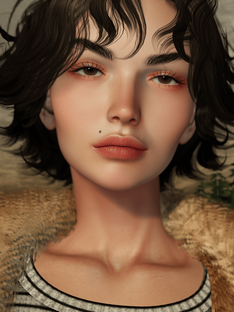 Aside from my Nuve Noelle eyebrows, I am wearing everything The Skinnery today. The blush and lippie came with Bianca, and the other markings on my skin are from the various skin add-on packs from The Skinnery. My hair is Tram P0108, also available at Collabor88.