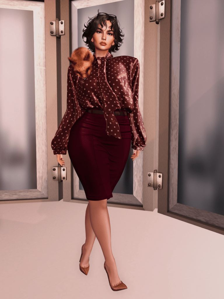 I decided to go for the burgundy color today. It’s one of the hot colors of this winter season, and it matches Erratic‘s Wexler skirt perfectly. My Joy Pointy pumps in a beautiful camel-colored leather are from Gos Boutique, and I have casually tossed a Louane Fox fur from Dernier over my shoulder. Very Alexis!