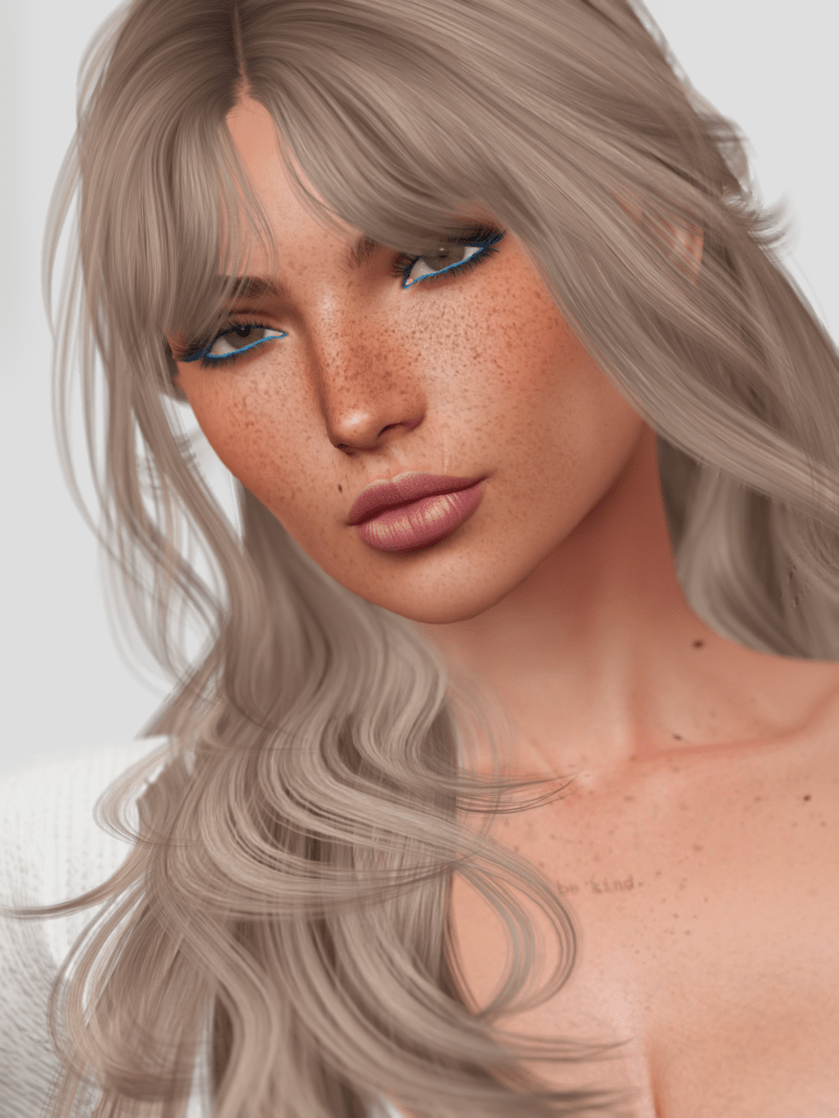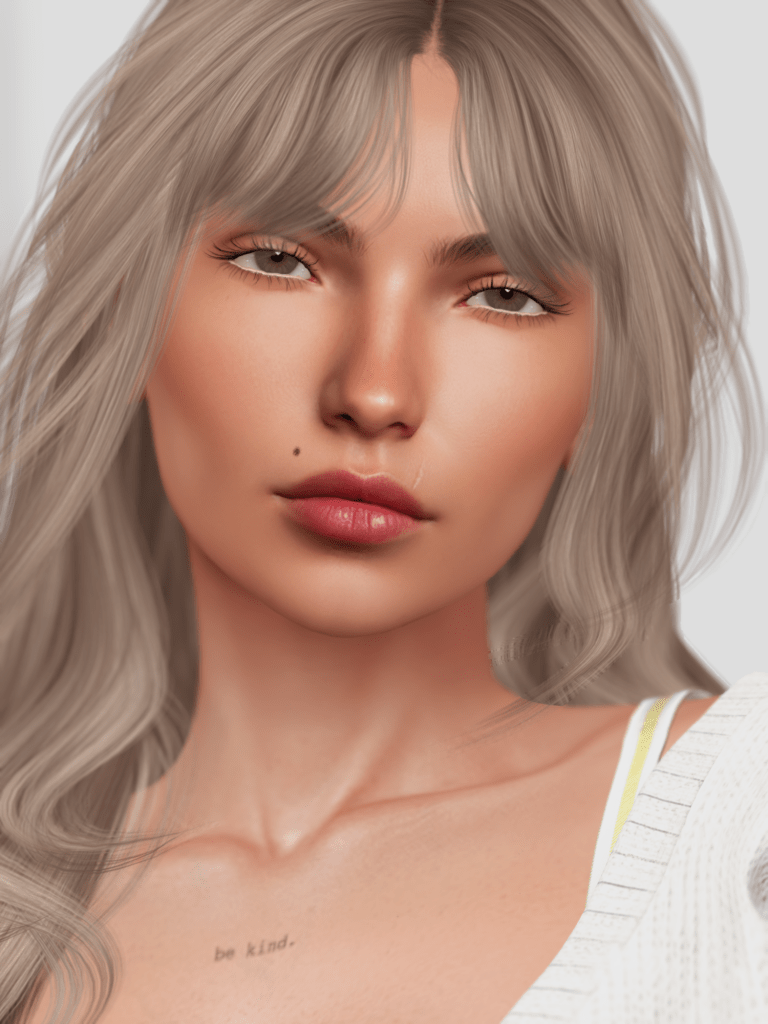 Her face is flawless, with the exception of the usual face marks I am always wearing these days. Her mouth is beautiful and just the teeniest bit off-symmetry it seems, which makes the skin have a character of her own. I am even wearing the skin with the eyebrows it came with.