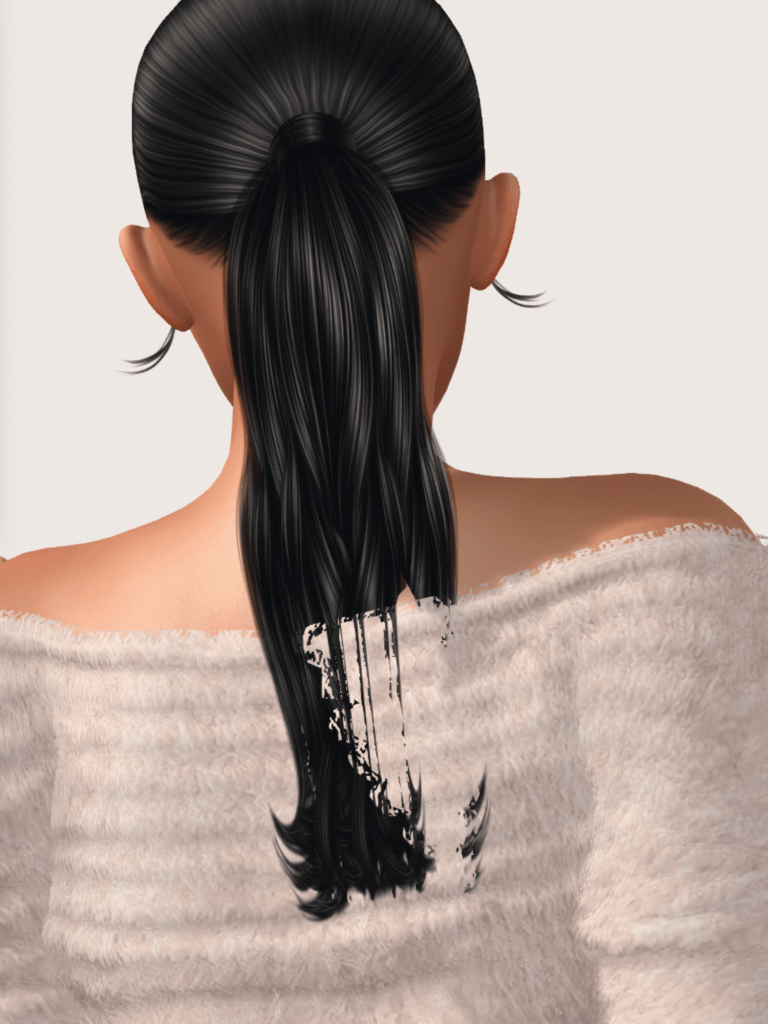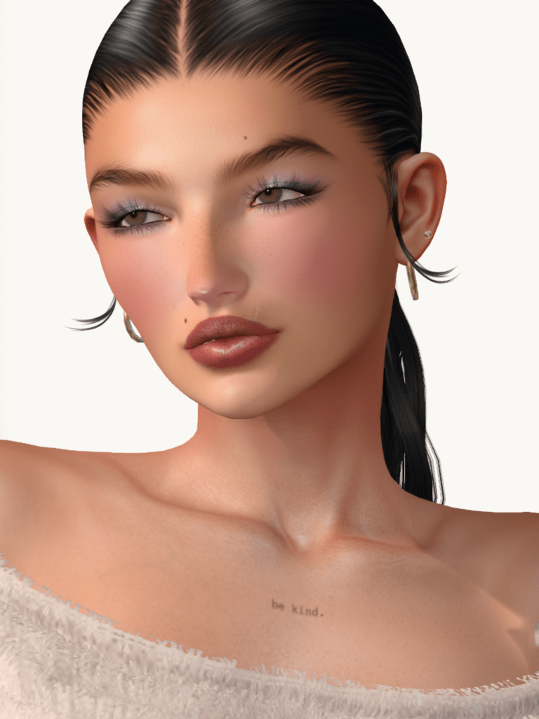 This is her, out of the box, with just the addition of my lip scar and moles. The soft brown (or is it mocha mousse?) eyes are from Avi-Glam‘s Appealing eyes set. My Bold Curve ponytail is from Studio Exposure, and the attachment is flexi, and honestly, I hate flexi hair. It looks out of date -2008 called, they want their hair back-, with the alpha-infested panels and always cutting into the avatar’s body, and I really don’t know why it has made a comeback, but: Studio Exposure‘s hair bases are awesome, and that is why I bought this one. And I can always switch out the flexi-nightmare for a stylish bun, or one of their non-flexi ponytails. See below what I mean when I say flexi-nightmare! So awkward! Seriously, don’t settle for this, there is better than flexi hair on the grid! Don’t buy it! Pun intended :D