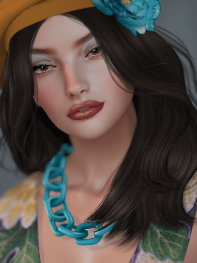 Today I am wearing Karla, by Voglia and my eye makeup, making my Avi-Glam Trendie eyes pop, is the Starstruck glitter shadow and liner by Jack Spoon (SkinFair 2025).. On my lips, Cazimi‘s Succulent lipstick (Skinfair 2025) and because I really liked them, I am wearing again the teeth addon which came with Mila‘s Beatriz skin (also Skinfair 2025)