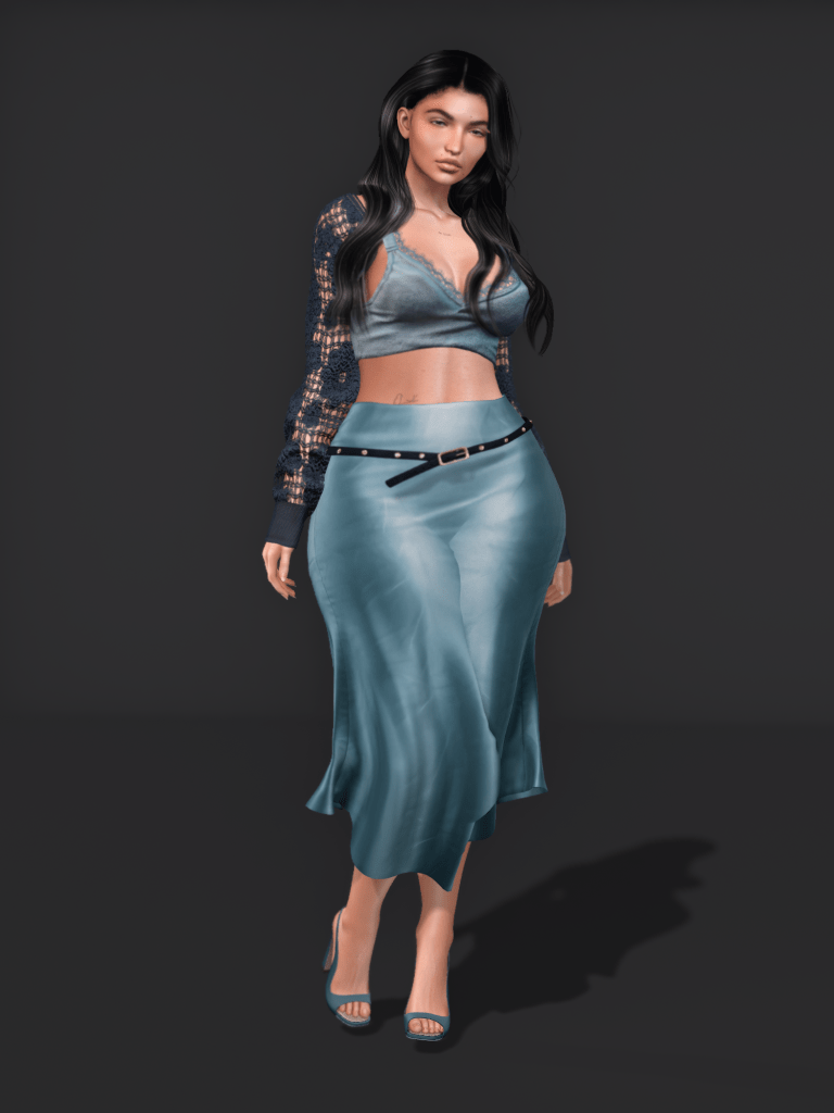 I’m not feeling blue today, yet my outfit is very blue. It started out with Promagic‘s Divine top, and before I knew it, it was paired with Fashionably Dead‘s Satin Midi skirt, and Tres Blah‘s Viola Bolero. Sometimes it doesn’t take long at all to combine those awesome items despite the bottomless pit which is my inventory.