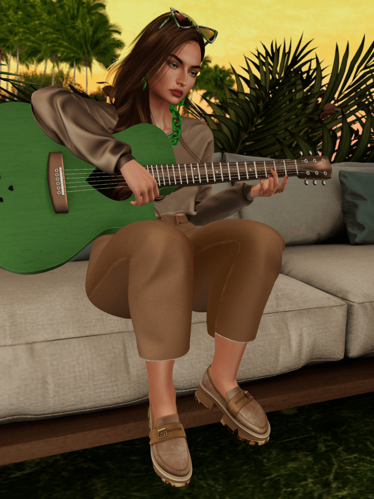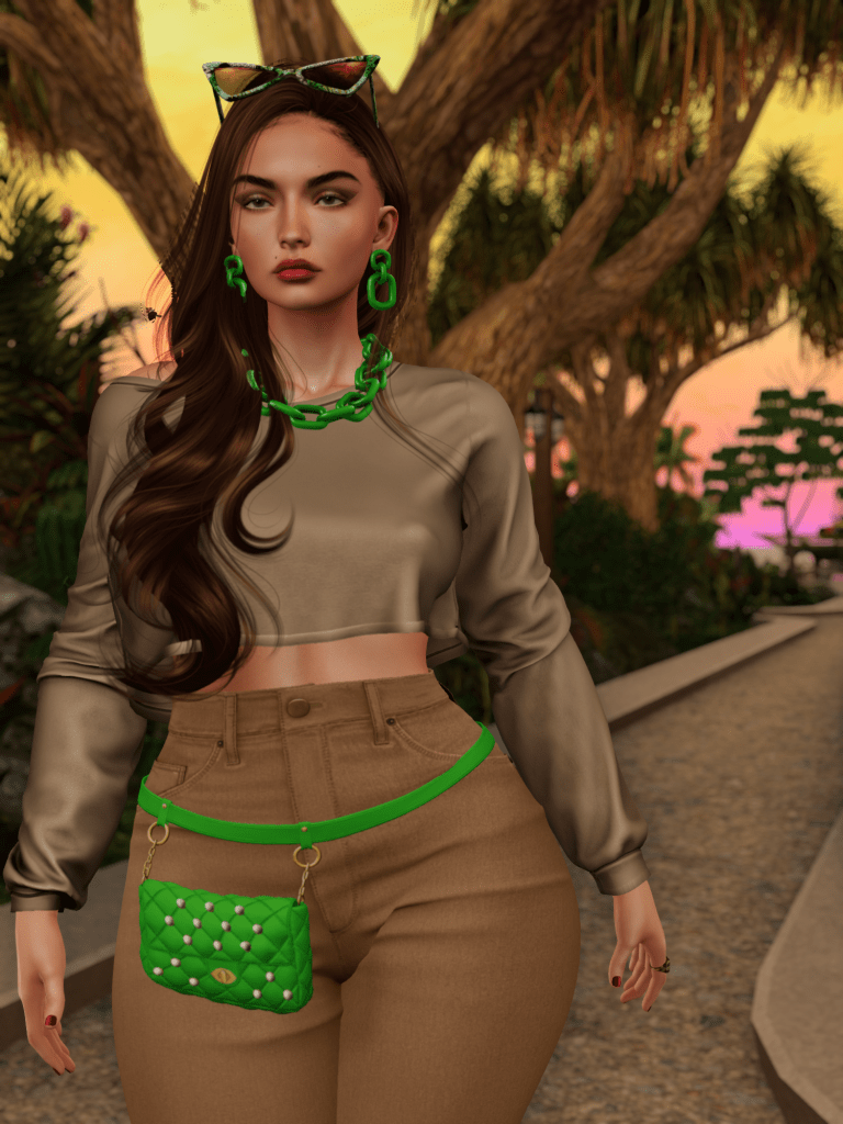 I’m wearing 4U’s Ariel top and Mellow Elie’s super high cutoffs. I was looking for a loafer to go with that, and went with Ginza’s Lingot d’Or platform loafers. These items all in various shades of beige. The contrast comes from La Gyo jewelry. I love the Lydia chain set for it’s bright colors and the Herve cateye sunglasses in a Florida print made me happy! And while I am usually not a fan of the so called fanny pack, Miss Chelsea’s Nava Fanny pack in green is an exception! Today’s hair is Possession from Faga for the Truth Collective.