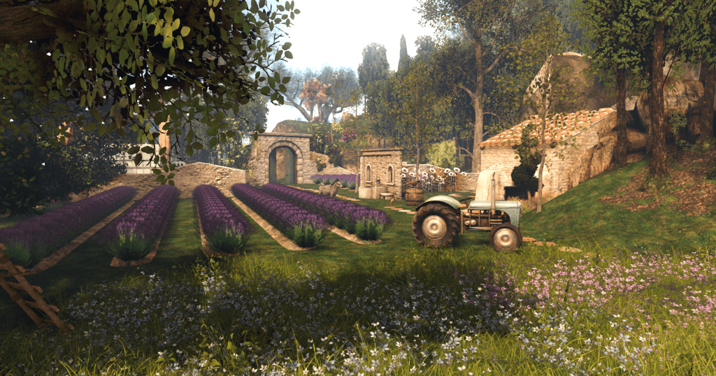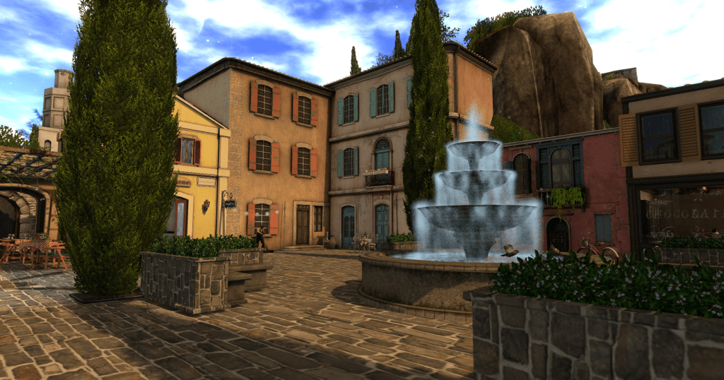 The current rendition of Garden of Whimsy is a delightful SL version of a Tuscan village. Having recently been back to Tuscany , I am smitten with this sim, parts of which remind me of the enchanting hilltop villages of Pitigliano and Montalcino, the narrow arched streets of Siena and the Chianti vineyards.