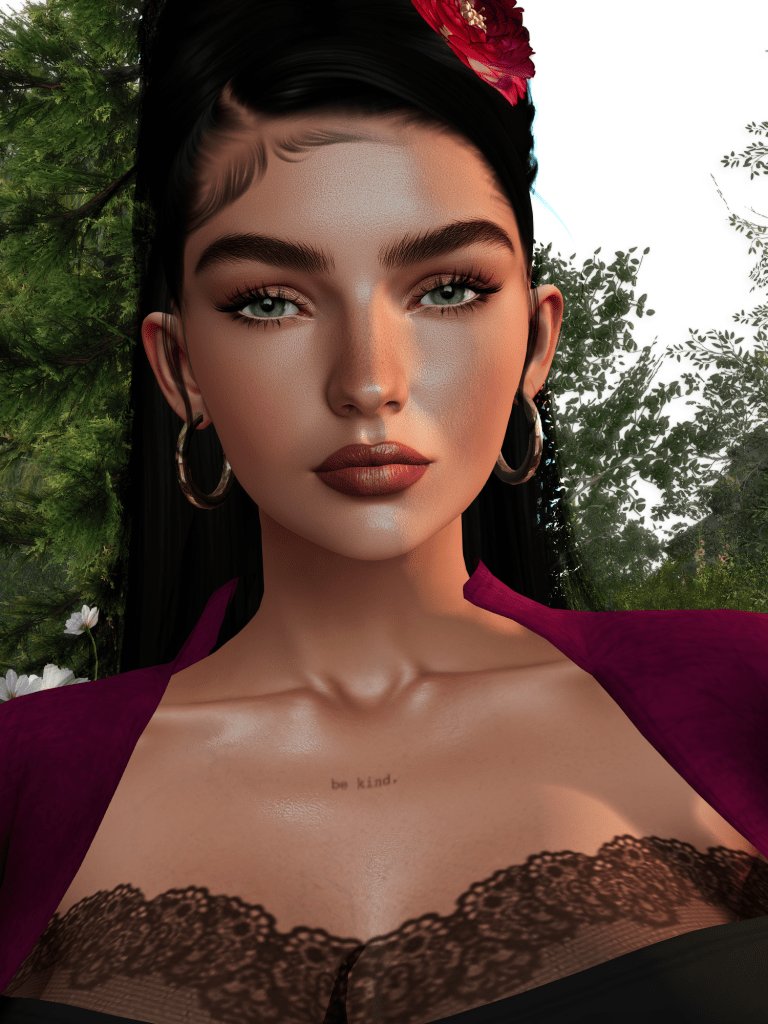 Normally, I avoid it like a Monday morning, but Platinum’s Irina hair is different. Their alpha handling is surprisingly clean, and this style has a back-swept version that spares you from the dreaded body-penetrating tendrils. I did skip the full forehead bang, though. It only works from the front, and the side view exposes a Grand Canyon-sized gap between bang and scalp—not the vibe. I added LaGyo’s Bella Ciao flower for a touch of vintage femininity. Chef’s kiss.
