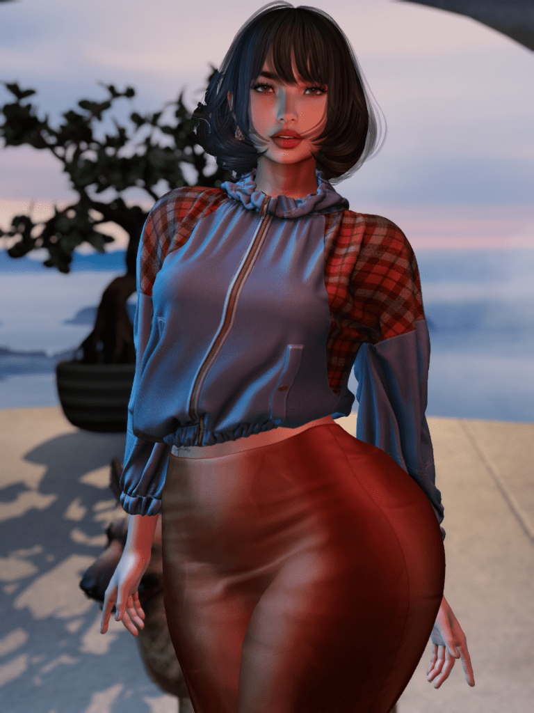 Beauty wise, I have been leaning into olive-toned skins. LeLutka’s Camille started this love affair, and now this recent release from Glam Affair has sealed the deal. Meet Phoebe, worn here in D001, paired with the lipstick that comes with her for a seamless fit. My hair is Tram P0825, newly released at Uber, and the finishing touch is Yummy’s Petit Perle earrings that somehow migrated from last night’s kitchen adventures into today’s look.