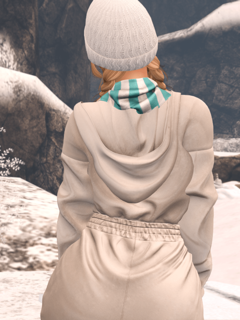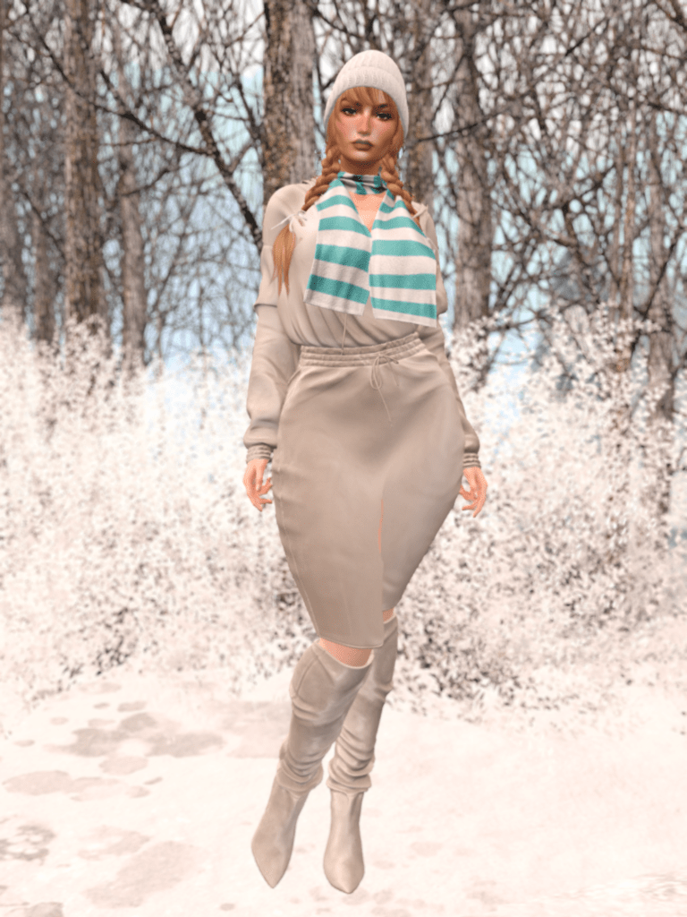 The beauty look follows the same direction. The Skinnery’s Winter skin on leLUTKA’s Madrid head gives a clear winter mood. Jack Spoon’s Cold Girl layers push that effect further. Exile’s Lumi hair with two braids adds character and keeps the look focused while keeping my head warm!