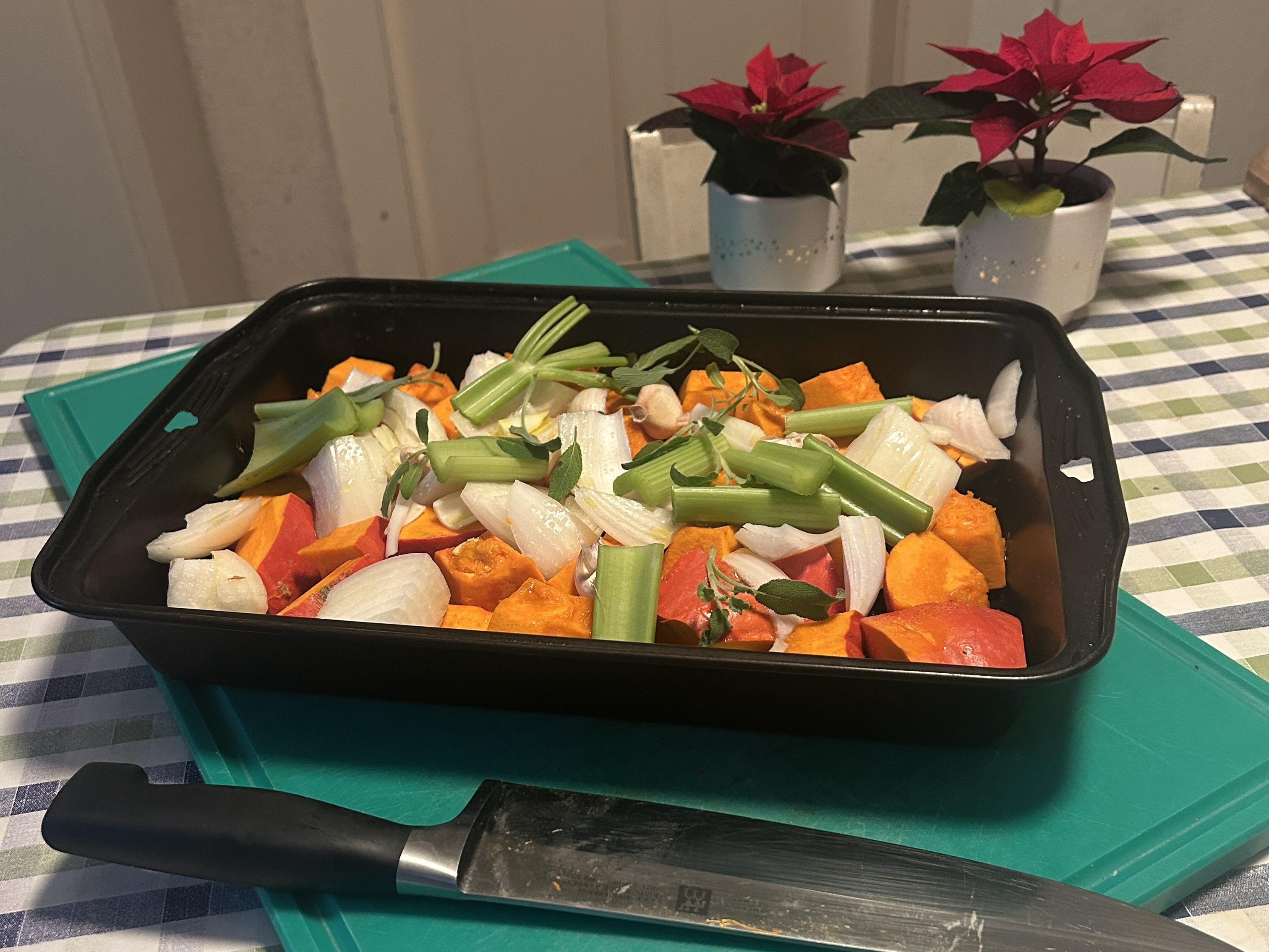 Of course I have not plated the final soup yet. Instead of the finished dish, I am sharing a photo of the vegetables ready for the oven. The vibrant colors a promise of the delicious result.