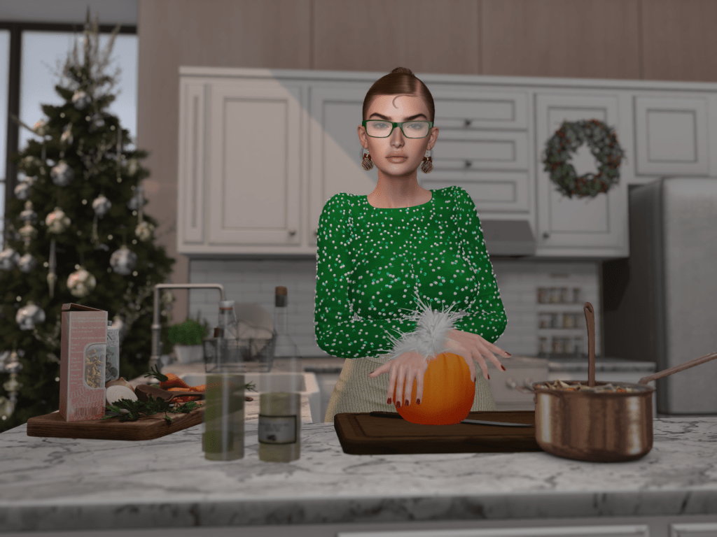 While cooking, I chose an outfit that felt comfortable but still festive enough for the season. I am wearing LeLUTKA’s Vela head, which was gifted to existing clients for the holidays, paired with Glam Affair’s Vela skin. The two work beautifully together and give a soft, balanced look. I kept things natural with Studio Exposure’s Metal Chrome updo and no makeup. Loveholic’s Madison glasses add a subtle accent. I paired Sorumin’s Twinkle Holiday top in green with the Catherine skirt by Just Because. To finish the look, I added Yummy’s Classic Ornament earrings, which felt just right for a Christmas kitchen moment.