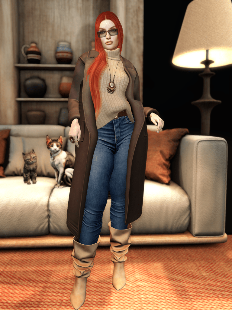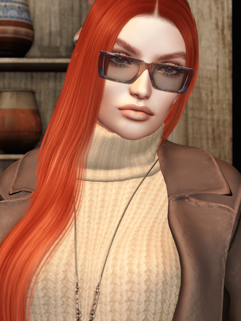 Beauty follows the same logic. Luma skin by Midori on LeLUTKA Madrid keeps the face soft and believable. Naomi hair by Saudade frames everything cleanly and lets the coat stay in charge despite the fiery red colour.